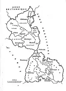 While France was not granted an occupation zone at the Yalta Conference in February 1945, Charles de Gaulle later successfully convinced the Allied leaders to allocate an area for French occupation. This comprised territory that had previously been part of the British and American zones. The French acquired the Saarland, the Palatinate, and territories on the left bank of the Rhine up to Remagen from the British zone, while the Americans ceded Baden south of Baden-Baden, some districts in the south of Württemberg, the Lindau district in Bavaria, and four districts in Hesse east of the Rhine.[3] The border between the American and French occupation zones in Baden and Württemberg was based on a map drawn by Dwight D. Eisenhower on 3 May. He recommended that, due to the transport links of the region, the districts of Karlsruhe and Mannheim, as well as the area around the Karlsruhe-Stuttgart-Ulm highway (today the A 8), be assigned to the U.S. zone. Anything south of these regions would fall under French occupation, including large parts of Württemberg and the entirety of the old Province of Hohenzollern.[4] The French government demanded all of Baden, but the American authorities refused to grant further concessions, and the French agreed to Eisenhower's proposal on 29 June. French forces left Stuttgart on 8 July, and the final agreement concerning the occupation zones was signed by the four powers on 26 July.