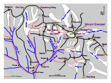 - ↑ Pethangtse lies on the ridge between Lhotse and Makalu. A pass east of Pethangtse had been reached from the Kama valley by the 1921 British Mount Everest reconnaissance expedition.