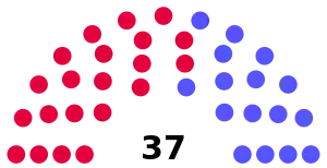 The election saw a large swing in favour of Labour, ending with a majority of 5 on the council. All seats were up for election as ward boundaries were redrawn and previously elected councilors' terms were cut short.[1] This resulted in three seats being contested in each of the 12 wards.[2] The 37th seat was that of the Dean of Guild, a member of the council appointed by the guilds of the city, who affiliated with the Progressives.[1][3]