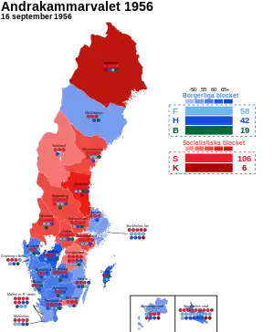 General elections were held in Sweden on 16 September 1956.[1][2] The Swedish Social Democratic Party remained the largest party, winning 106 of the 231 seats in the Andra kammaren of the Riksdag.[3] A Social Democratic-Farmers' League coalition government was formed by Prime Minister Tage Erlander after the election with 125 of the total of 231 seats. Although the non-socialist parties held a majority in the Second Chamber, the Social Democrats held a majority in the First Chamber, so a non-socialist government could not be formed.