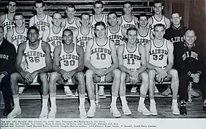 The 1958-59 team utilized several returning lettermen including the leading scorer, team "captain" and team "MVP" Roger Taylor. It also saw the return of Mannie Jackson, Govoner Vaughn, Bruce Bunkenberg, Al Gosnell, Lou Landt and Ed Perry. The Illini finished the season with a conference record of 7 wins and 7 losses, finishing tied for 5th place in the Big Ten. They would finish with an overall record of 12 wins and 10 losses. During the season, the Illini would play Kentucky, the No. 1 ranked team in the nation, at a Freedom Hall in Louisville. The outcome of this game would be a 75-76 loss. The starting lineup included John Wessels at the center position, Roger Taylor and Mannie Jackson at guard and Govoner Vaughn, Ed Perry and Al Gosnell at the forward slots.[1]