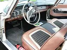 The flagship model was the Custom Royal. It came with the 350 in3 (5.7 L) Ram Fire V8 with a standard two-barrel carburetor, but the optional four-barrel carburetor delivered 300 hp (224 kW). A feature of the Custom Royal was its bumper-mounted exhaust ports which were only available on the Royal and Coronet models as part of the D-500 options. Identifying exterior characteristics include Custom Royal script at the trailing edge of the belt-line molding, the pronounced check-mark, gold anodized Dodge block letters on the hood, and gold anodized Dodge script on the passenger side of the trunk. Fin cap inserts were anodized and had a unique rectangular pattern. All Custom Royals included a stainless molding above the bumper, on the flat edge below the trunk opening. Body styles offered were sedan, two-door hardtop (Lancer), four-door hardtop (Lancer), and two-door convertible (Lancer). Lancers were further identified by a lance and shield emblem on each fin.