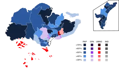 The result was a landslide win for the PAP, with the SPA lost 35 of the 39 contested constituencies and only four members represented the new Assembly, while both the Labour Front and its right-wing coalition party, the Liberal Socialist Party (which formed by a merger of the Democratic Party and Progressive Party) saw disastrous performances and neither party won seats; a total of 73 candidates (including 20 LSP candidates) lost their $500 election deposit.