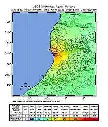 The 1960 Agadir earthquake occurred 29 February at 23:40 Western European Time near the city of Agadir, located in western Morocco on the shore of the Atlantic Ocean. Despite the earthquake's moderate Mw scale magnitude of 5.8, its relatively shallow depth (15.0 km[7]) resulted in strong surface shaking, with a maximum perceived intensity of XI (Extreme) on the Mercalli intensity scale. Between 12,000 and 15,000 people (about a third of the city's population of the time) were killed and another 12,000 injured with at least 35,000 people left homeless, making it the most destructive and deadliest earthquake in Moroccan history. Particularly hard hit were Founty, the Kasbah, Yachech/Ihchach and the Talborjt area. The earthquake's shallow focus, close proximity to the port city of Agadir, and unsatisfactory construction methods were all reasons declared by earthquake engineers and seismologists as to why it was so destructive.