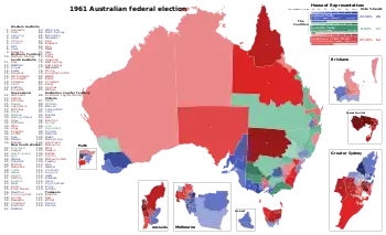 For a long time, the 1961 election remained the closest Federal election in Australian history, with the Coalition being reduced to the barest majority. Despite not having a majority of seats in New South Wales and Queensland the Coalition retained all of their seats in Victoria and could retain power.[2] The election was decided in the seats of Bruce near Melbourne and Moreton near Brisbane where the Liberal Party won the seat by 130 votes due to Communist Party preferences.