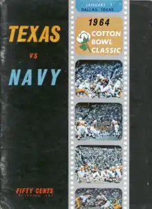 The 1964 Cotton Bowl Classic was the 28th edition of the college football bowl game, played at the Cotton Bowl in Dallas, Texas, on Wednesday, January 1. Part of the 1963–64 bowl game season, the game was a de facto national championship game;[1] the top-ranked and undefeated Texas Longhorns, champions of the Southwest Conference, defeated the #2 Navy Midshipmen, 28–6.[2][3][4][5]