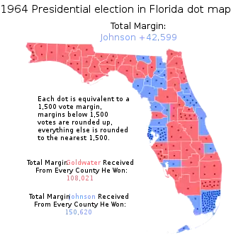 However, amidst a national Democratic landslide, Florida weighed in as a massive 20.28% more Republican than the nation at large, the most Republican Florida has ever been compared to the nation at large. Although Johnson carried 20 of the state's 67 counties, in only two of them, Monroe and Dade, did he exceed his nationwide vote share of 61.05%.[7]