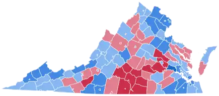 As of the 2020 presidential election, this remains the last occasion when Amherst County, Bland County, Clarke County, Culpeper County, Fauquier County, Frederick County, Rockingham County, Washington County and York County have voted for a Democratic presidential candidate.[22] It is also the only time since 1948 Waynesboro City has voted for a Democrat for president, while Prince William County and Winchester City would not vote Democratic again until 2008.[20] Fairfax County, Virginia's most populous county, would not vote Democratic again until 2004, having previously voted Democratic in 1940.[20] The independent city of Virginia Beach would not vote Democratic again until 2020. This also remains the last time that Virginia and neighboring West Virginia would simultaneously vote Democratic in a presidential election.