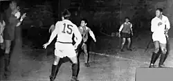 A moment of the match between River (in red shirt) v Santos. Brazilian goalkeeper Gilmar (at left) holding the ball