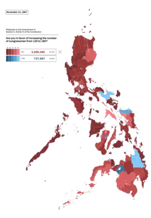 A constitutional referendum was held in the Philippines on 14 November 1967. On 16 March 1967 Congress decided that a Constitutional Convention would be elected in 1971. In preparation for the election, two amendments to the constitution were proposed beforehand.[1] Voters were asked whether they approved of two amendments to the Constitution of the Philippines; one to increase the number of members of the House of Representatives from 120 to 180, and one to allow members of Congress to be elected to Constitutional Conventions without giving up their Congress seats.[1] A petition seeking to stop the referendum was filed before the Supreme Court, but was dismissed five days before the referendum.[2] Both proposals were rejected by voters.