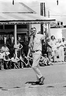 On March 17, Chiles began the walk starting in Century, a small town in Escambia County along the Alabama state line. He initially headed east along State Road 4, toward Tallahassee.[5] Throughout the journey, a number of people walked a small portion of the distance, including State Senators Wilbur H. Boyd – uncle of State House member Jim Boyd – and Bob Saunders.[6][7] Upon reaching the community of Milligan, Chiles turned onto U.S. Route 90, then the main highway through the Florida Panhandle, toward Crestview.[8] On April 7, he reached Tallahassee and remained there during the Florida Legislative session, which lasted 60 days.[9] Thereafter, he continued on Route 90 for several days, until reaching Lake City, where he began heading along State Road 100 to the city of Lake Butler.[10]