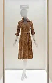 New technologies brought advances in production through mass production, higher efficiency, generating higher standards and uniformity. Generally the most famous silhouette of the mid and late 1970s for both genders was that of tight on top and loose on bottom. The 1970s also saw the birth of the indifferent, anti-conformist casual chic approach to fashion, which consisted of sweaters, T-shirts, jeans and sneakers.[3] One notable fashion designer to emerge into the spotlight during this time was Diane von Fürstenberg, who popularized, among other things, the jersey "wrap dress".[4][5] von Fürstenberg's wrap dress design, which was among the most popular fashion styles of the 1970s, would also be credited as a symbol of women's liberation.[6][7] The French designer Yves Saint Laurent and the American designer Halston both observed and embraced the changes that were happening in the society, especially the huge growth of women's rights and the youth counterculture. They successfully adapted their design aesthetics to accommodate the changes that the market was aiming for.