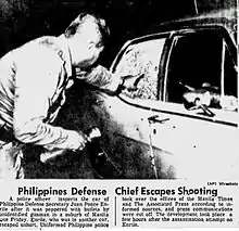 On the evening of September 22, 1972, news reports were full of accounts that the car of Defense Minister Enrile had been attacked near the upscale Wack Wack subdivision in Mandaluyong. Witnesses had reported hearing gunshots, and then seeing a bullet riddled car on the road after the sound of gunfire had ceased. Further reports during that evening no longer came out, because martial law was implemented in the minutes leading up to midnight.[8] Various conflicting accounts of that eventing's events have surfaced over the years, including a diary recollection by Ferdinand Marcos, a witness account by Wack Wack resident Oscar Lopez,[9] and two conflicting accounts by Enrile himself.[10]