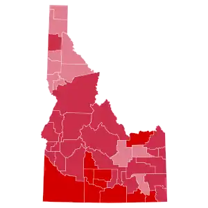In a state that would reflect McGovern's national results,[5][6] the Democratic nominee did not win a single county in Idaho. In fact, John G. Schmitz, running under the "American Independent" banner as a remnant of George Wallace's 1968 campaign, ran second ahead of McGovern in Fremont, Jefferson, Lemhi and Madison Counties.[7] Although due to the salience of the civil rights issue there had occurred numerous cases of unpledged and "Dixiecrat" candidates receiving almost the entire vote of Deep Southern counties, and a smaller number in other antebellum slave states, Schmitz' performances in Jefferson County was at the time the best by a third-party presidential candidate in any non-Southern county since 1936 when William Lemke reached over twenty-eight percent of the vote in the North Dakota counties of Burke, Sheridan and Hettinger.[8] With 9.30% of the popular vote, Idaho would be Schmitz's strongest state in the 1972 election.[9]