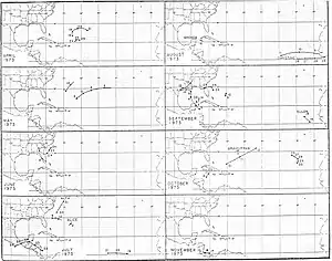 In addition to the eight named storms of 1973 and two notable tropical depressions, there were several minor systems that were classified as depressions by the National Hurricane Center.[5] The first four systems of the year were not classified as fully tropical, rather they were associated with the remnants of decaying cold fronts. On April 18, the first of these depressions formed northeast of the Bahamas and tracked in a curved motion before dissipating over open water on April 21. Several days later, on April 24, another depression formed in the same general region; however, this system was shorter lived and dissipated two days later without significant movement. On May 2, another partially tropical system formed over open waters. The cyclone tracked northeast and dissipated late on May 5 east-southeast of the Azores. On May 11, a brief depression formed near Bermuda but dissipated the following day.[4] Roughly a week into the official hurricane season, the fifth depression of the year formed just offshore southeast Florida, near Miami. The system tracked northwest across the peninsula and briefly entered the Gulf of Mexico on June 8 before making landfall along the Florida Panhandle. The depression eventually dissipate on June 10 over South Carolina.[4]