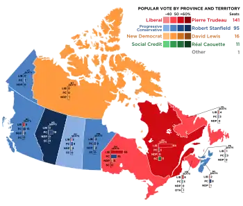 | Liberal | Pierre Trudeau | 264 | 109 | 109 | 141 | +29.4% | 4,102,853 | 43.15% | +4.73pp | |