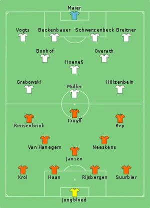 It turned out to be Müller's last goal for the West German team, as he retired from international football after the tournament. As the teams walked off the pitch at half-time, Cruyff was booked for arguing with the referee.[3]
