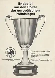 The 1975 European Cup Winners' Cup Final was a football match contested between Dynamo Kyiv of the Soviet Union and Ferencváros of Hungary. It was the final match of the 1974–75 European Cup Winners' Cup and the 15th European Cup Winners' Cup final. The final was held at St. Jakob Stadium in Basel, Switzerland. Dynamo won the match 3–0 thanks to goals by Vladimir Onishchenko (2) and Oleg Blokhin.