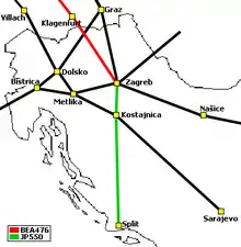 Zagreb FIR in 1976, showing route of BA476 (red) and JP550 (green). Not to scale.