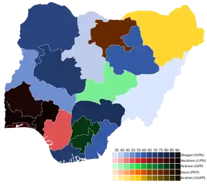 States won by Shagari (in blue), Awolowo (in red), Azikiwe (in green), Kano (in orange) and Ibrahim (in yellow)