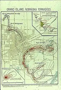 | F3 | Grand Island | Hall | NE | 40°58′N 98°21′W / 40.97°N 98.35°W | 0205–0230 | 2.3 mi (3.7 km) | 500 yd (460 m) | 1 death – Tornado touched down north of Grand Island and moved into the city near Airport Road, between US 281 and Webb Road. Third of seven tornadoes to hit the city in just over two hours. The tornado injured 40, killed one, and caused an estimated $2.5 million in damages. Although most damage was rated F0, several homes were heavily damaged and some F3 damage was noted near the veteran's home, which had windows blown out. Second of three anticyclonic tornadoes. While the path is officially listed as 2.3 miles (3.7 km), the distance covered by the tornado was 3.5 miles (5.6 km) due to its curving nature.[3][4] |