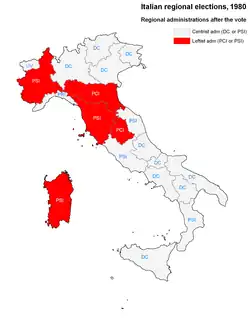 The election confirmed that the post-war growing march of the Italian Communist Party, which previously seemed unlimited, had been stopped. The Christian Democrats obtained a plurality in Piedmont, even if the ruling leftist alliance maintained its overall majority. Conversely, even if remaining the first party in Ligury, the Communists lost this region because the local Socialists chose to change side, joining a centrist alliance with the DC and its minor allies. In Latium, where an assembly majority change, happened in 1977, had restored a centrist administration, the final ouster of the Communists from the government was confirmed by the polls.