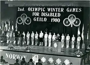 The 1980 Winter Paralympic Games (Norwegian: Paralympiske vinterleker 1980; Nynorsk: Paralympiske vinterleikane 1980), the second Winter Paralympics, were held from 1 to 7 February 1980 in Geilo, Norway. Eighteen countries took part with 299 athletes.[1] A demonstration event was held in sledge downhill racing. All classes of athletes with locomotor disabilities were able to participate.[2] Organized by the International Stoke Mandeville Games Federation (ISMGF) and the International Sports Federation of the Disabled (ISOD).[3]