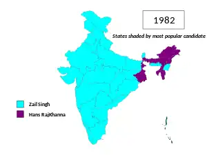 The Election Commission of India held indirect eighth presidential elections of India on 12 July 1982. Zail Singh with 754,113 votes won over his nearest rival Hans Raj Khanna who got 282,685 votes.[1] Zail Singh was the first and till date only Sikh to be the President of India.