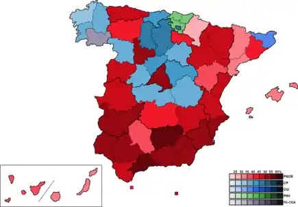 | Spanish Socialist Workers' Party (PSOE) | 7,883,502 | 43.05 | +14.90 | 23,729 | +11,660 | |