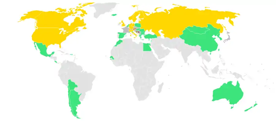 Participating NOCs[18] with:   at least one gold medal;   at least one silver medal;   at least one bronze medal;   no medals. Red diamond: first medal. Yellow circle: host country.