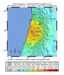 The 1985 Rapel Lake earthquake[4][5] occurred on 8 April at 21:56:59 local time with a moment magnitude of 7.5 and a maximum perceived intensity of VI (Strong).[6] The shock was centered 75 kilometres (47 mi) southwest of Santiago, Chile,[3] with a focal depth of 37.8 km (23 mi).[7]