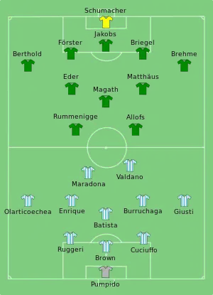 José Luis Brown opened the scoring for Argentina in the 23rd minute with a header after an error of the German Keeper Harald Schumacher on a free-kick from the right and it stayed at 1–0 until half-time. 11 minutes into the second half, Jorge Valdano doubled Argentina's lead with a low side foot finish after cutting in from the left past the advancing goalkeeper. Karl-Heinz Rummenigge pulled a goal back in the 74th minute from close range for West Germany, his first goal in the tournament. West Germany then equalised in the 81st minute, with Rudi Völler scoring with a header from close range. Although Diego Maradona was heavily marked by Lothar Matthäus throughout the game, his pass to Jorge Burruchaga in the 84th minute allowed Argentina to regain the lead at 3–2 when he slid the ball past the advancing goalkeeper from the right and into the corner of the net.[3][4]