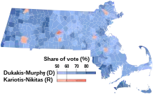Dukakis won a convincing victory over Kariotis. He increased his margins across the state, winning all 14 counties with a majority, even as total vote numbers were down sharply from the previous election.[11]