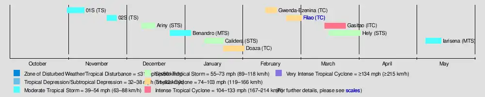 Cyclone Filao was the most notable storm of the season, originating in late February off northern Madagascar. It ultimately struck Mozambique on March 1, where it killed about 100 people and left $10 million in damage (1988 USD). In January, both tropical storms Calidera and Doaza crossed Madagascar, the latter of which helped end a drought. Long-lasting Tropical Storm Hely also struck the country in March. The strongest cyclone of the season was Gasitao, which formed at the same time as Hely and attained peak winds of 150 km/h (93 mph). The season ended when Tropical Storm Iarisena dissipated northeast of Madagascar in the middle of May.