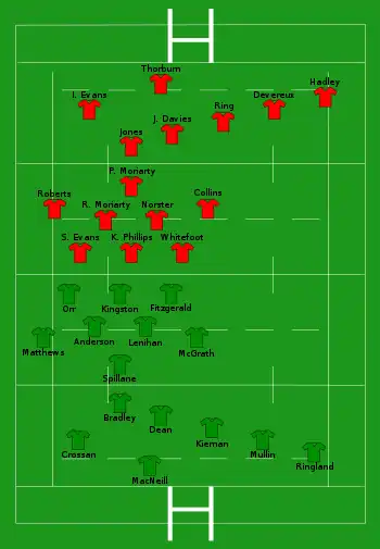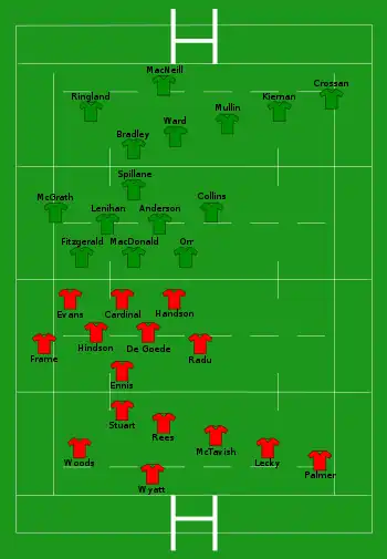 | Try: Cardinal Pen: Rees (3) Wyatt Drop: Rees | Try: Crossan (2) Bradley Spillane Ringland MacNeill Con: Kiernan (5) Pen: Kiernan (2) Drop: Ward Kiernan |
