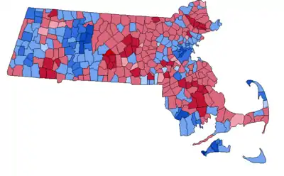 As of 2020, this was the last time that the cities of Amesbury, Attleboro, Beverly, Braintree, Brockton, Franklin, Leominster, Marlborough, and Methuen and the towns of Abington, Alford, Auburn, Avon, Ayer, Barnstable, Massachusetts, Bedford, Bernardston, Bolton, Boxborough, Buckland, Burlington, Canton, Carlisle, Charlemont, Chelmsford, Clinton, Cummington, Danvers, Dedham, Dennis, Erving, Essex, Florida, Gosnold, Grafton, Groton, Hancock, Harvard, Harwich, Hawley, Holbrook, Holliston, Hopedale, Hudson, Ipswich, Littleton, Longmeadow, Manchester-by-the-Sea, Mansfield, Marblehead, Marion, Mattapoisett, Medway, Milton, Mount Washington, Needham, New Ashford, New Salem, Newbury, Northborough, Norton, Peru, Petersham, Plymouth, Reading, Rockland, Savoy, Sheffield, Shelburne, Shirley, Shrewsbury, Southborough, Southampton, Stow, Sudbury, Wakefield, Wellesley, West Newbury, Westborough, Westford, Westhampton, Weston, Winchester, Windsor, and Yarmouth voted Republican.