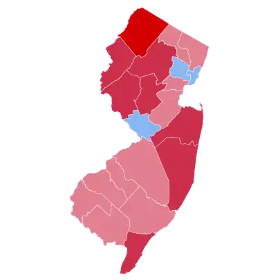 As of 2020, this remains the last time that New Jersey would vote Republican in a presidential election, as well as the last time that the Republican nominee has carried the following counties: Atlantic, Burlington, Camden, Cumberland, Middlesex, and Union.[2] All of these counties would become reliably Democratic in every election that has followed, as northern suburban voters shifted away from the GOP in the 1990s. Gloucester County has voted Republican once since, in 2016, although this is the last time a Republican won a majority of the vote there.