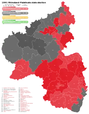 The 1991 Rhineland-Palatinate state election was held on 21 April 1991 to elect the members of the Landtag of Rhineland-Palatinate. The incumbent coalition government of the Christian Democratic Union (CDU) and Free Democratic Party (FDP) led by Minister-President Carl-Ludwig Wagner was defeated, losing its majority. The Social Democratic Party (SPD) moved into first place, forming a coalition with the FDP. SPD leader Rudolf Scharping was subsequently elected as Minister-President.