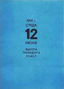Presidential elections were held in the Russian Soviet Federative Socialist Republic (RSFSR) on 12 June 1991.[1] This was the first Russian presidential election in the country's history. The election was held roughly three months after Russians voted in favor of establishing a presidency and holding direct elections in a referendum held in March that year. The result was a victory for Boris Yeltsin, who received 58.6% of the vote.[2]