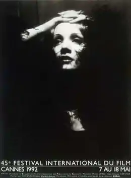 Official poster of the 45th Cannes Film Festival, featuring a portrait of German actress Marlene Dietrich by Don English.[1]
