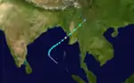 Following six months of inactivity across the Northern Indian Ocean, a tropical disturbance developed within a monsoon trough over the Bay of Bengal on May 15. Initially poorly organized, the system developed into a tropical depression the following day as it moved northwestward. Intensification was slow at first as the storm turned to the northeast. As it approached Myanmar, the Joint Typhoon Warning Center (JTWC) estimated it to have attained winds of 120 km/h (75 mph), equivalent to a low-end Category 1 hurricane on the Saffir–Simpson hurricane scale.[6] The India Meteorological Department (IMD), however, estimated the system to have been considerably weaker and only upgraded it to a cyclonic storm with 65 km/h (40 mph) was as it made landfall in Rakhine State on May 19.[4] Once onshore, the storm accelerated and weakened, being last noted early on May 20 as a dissipating system near the Myanmar–China border.[6]