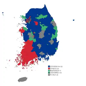 Legislative elections were held in South Korea on 25 March 1992.[1] The result was a victory for the Democratic Liberal Party, which won 149 of the 299 seats in the National Assembly. However, DLP's seats shortened from 218 to 149 seats, less than 150 needed for majority, so this regarded as retreat. Voter turnout was 71.9%.