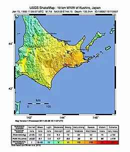The 1993 Kushiro–Oki earthquake (釧路沖地震, Kushiro-Oki Jishin) was one of two large earthquake to strike the Japanese island of Hōkkaido within the same year. The earthquake with a magnitude of 7.6 Mw or 7.8 MJMA struck at 11:06 UTC or 08:06 pm JST on January 15 near the town of Ashoro. Shaking reached a maximum intensity of IX (Violent) on the Mercalli intensity scale, causing considerable damage, and was felt throughout the island, into northern Honshu, Sakhalin, and the Kuril Islands. As a result of the tremors, two people were killed and more than 600 were wounded.[5]