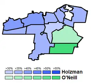 Despite the three way race, Holzman won all but two of the city's wards. She was particularly strong in the city's west end, with her best ward being Ward 1 (renamed Britannia-Richmond in 1995), which she had represented part of on council from 1982 to 1991. O'Neill won the remaining two wards, both in the city's south end. Her best ward was Ward 3 (renamed Southgate in 1995), which she had represented on council. Kehoe did not win any wards, but was strongest in the central part of the city, and came within 90 votes of winning Ward 5 (renamed Bruyère-Strathcona in 1995).