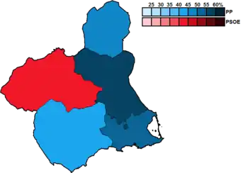 The regional election resulted in the PP consolidating its gains, winning by a landslide as the vote for the ruling PSOE plummeted.[7] PP leader Ramón Luis Valcárcel would become the new President of the Region of Murcia,[8] with the PP remaining in government ever since. The PP would also remain the prime party of Murcian politics until 2019.