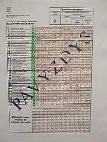 The elections were also the first to allow voters to give preference votes to candidates on electoral lists, although their influence was limited (as some parties hadn't allowed this option for their lists).[4] This system allowed voters to cast both positive and negative preference votes (the latter option allowed to express disapproval of candidates). Similar preference votes' system is used for Latvian parliamentary elecions.