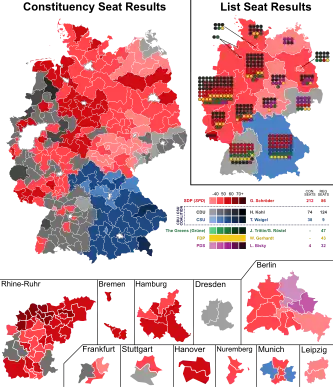 Federal elections were held in Germany on 27 September 1998 to elect the members of the 14th Bundestag. The Social Democratic Party (SPD) emerged as the largest faction in parliament for the first time since 1972, with its leader Gerhard Schröder becoming chancellor. The Christian Democrats had their worst election result since 1949.[1]