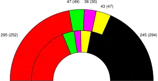 Last election 36.4%, 252 seats 41.4%, 294 seats 7.3%, 49 seats