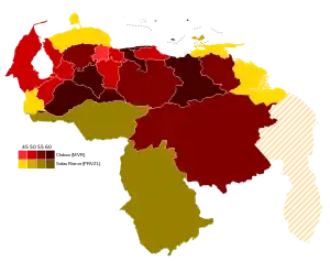 The two traditional main parties hoped that 8 November parliamentary and regional elections would give them a boost, a month ahead of 8 December presidential elections, but the poll remained a two-horse race.[4] At this point polls generally showed Chávez with a 6–12-point lead over Salas Römer's approximately 38% poll numbers, though in some polls he exceeded that margin.[4] Both COPEI and Democratic Action now sought to endorse Salas Römer (he was reluctant to accept). COPEI persuaded its candidate (Sáez) to resign, but Democratic Action's candidate, Alfaro Ucero, refused to do so, triggering an electoral crisis as the National Electoral Council had to rule on whether the Democratic Action ballot slot belonged to the party or the candidate.[4] Salas Römer agreed to accept the endorsement of COPEI and Democratic Action regional and local parties, and sought to maintain a distance to the parties' national leadership.[4] In the end, it was not enough, and Chávez won a substantial majority, and won 17 of 23 states.[4]