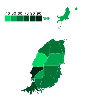 The results saw the governing New National Party re-elected after winning all 15 seats contested.[8] Among the victorious candidates for the governing party was the Prime Minister Keith Mitchell, who won his own seat of St George's Northwest with 89% of the vote.[5] This was only the second time since independence a government had been re-elected in Grenada, and the first since 1976.[6][9]